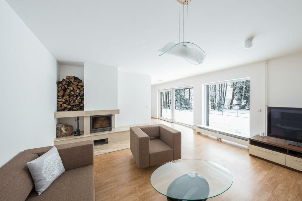 V přízemí se nachází prostorná kuchyň s jídelnou a komfortní obývací pokoj s krbem. Čelní stěna, orientovaná na jih, je prosklená se samostatným výstupem na terasu a výhledem na okolní krajinu. V prvním poschodí se nachází 3 ložnice, koupelna a otevřené atrium s lenoškou.